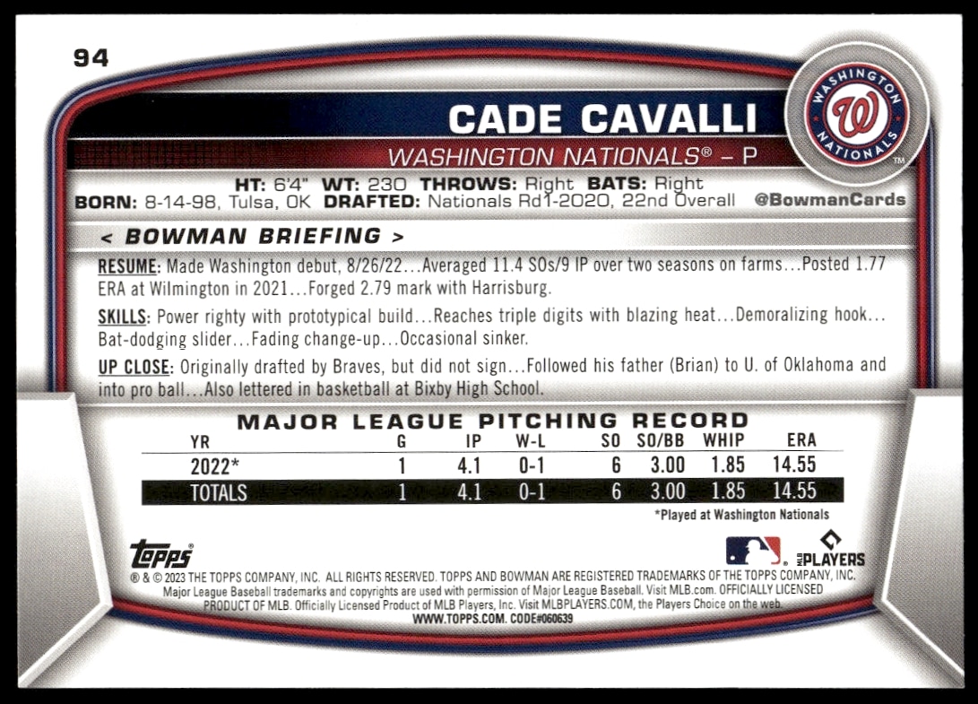 This Baseball card, from 2023 is part of the Bowman card set. Cade Cavalli is featured and has a card number of 94.