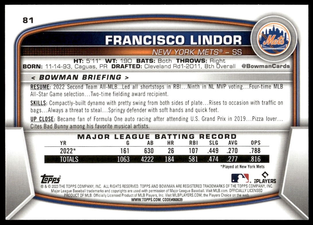 This Baseball card, from 2023 is part of the Bowman card set. Francisco Lindor is featured and has a card number of 81.