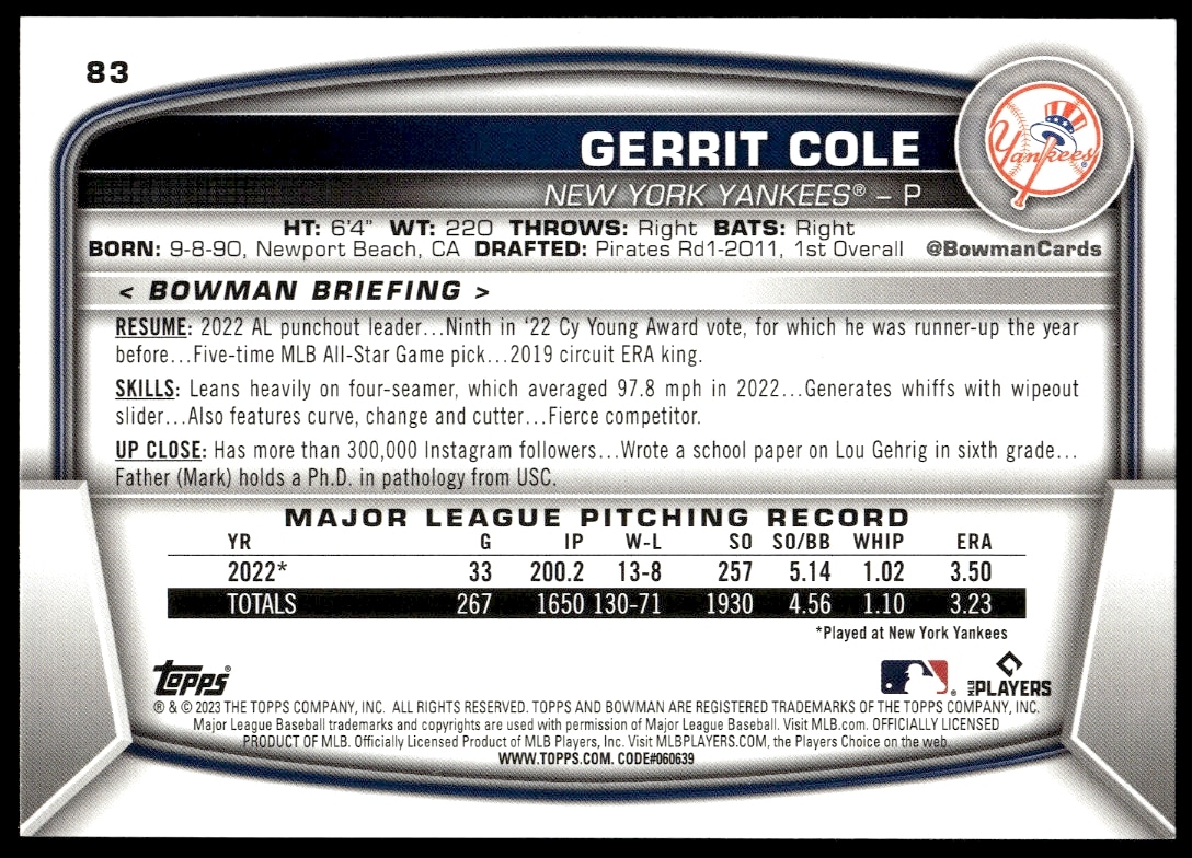 This Baseball card, from 2023 is part of the Bowman card set. Gerrit Cole is featured and has a card number of 83.