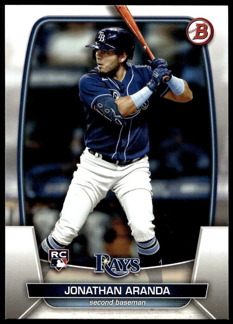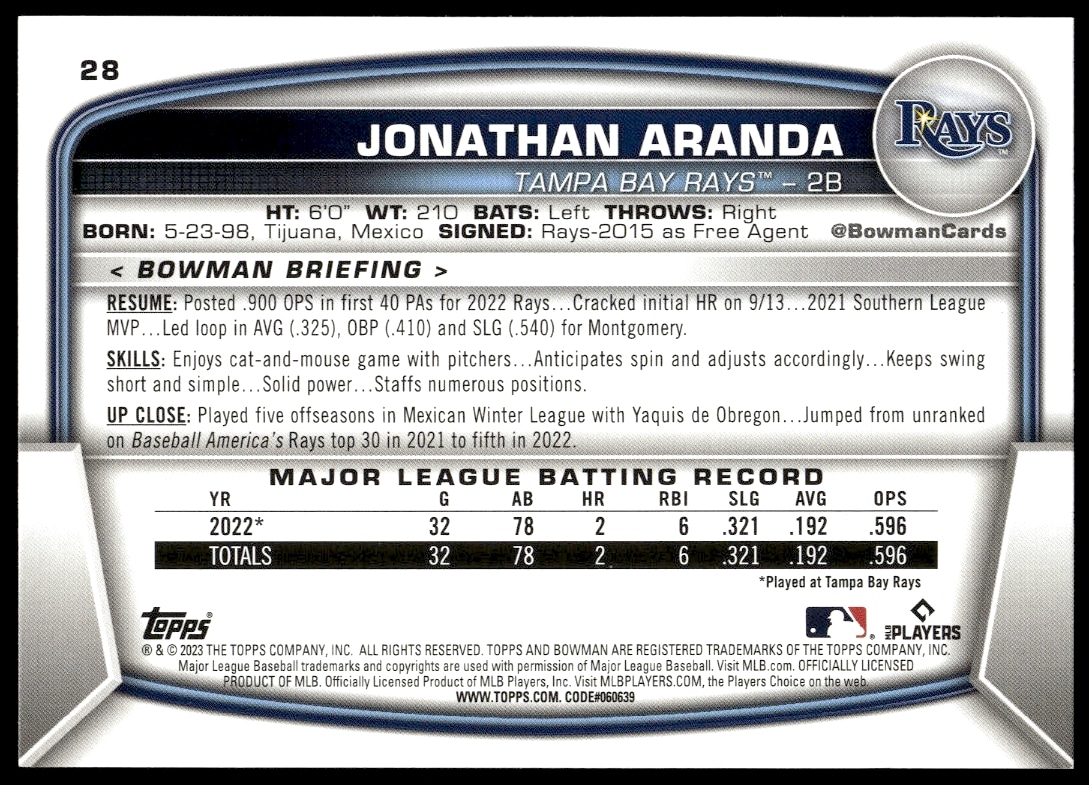 This Baseball card, from 2023 is part of the Bowman card set. Jonathan Aranda is featured and has a card number of 28.