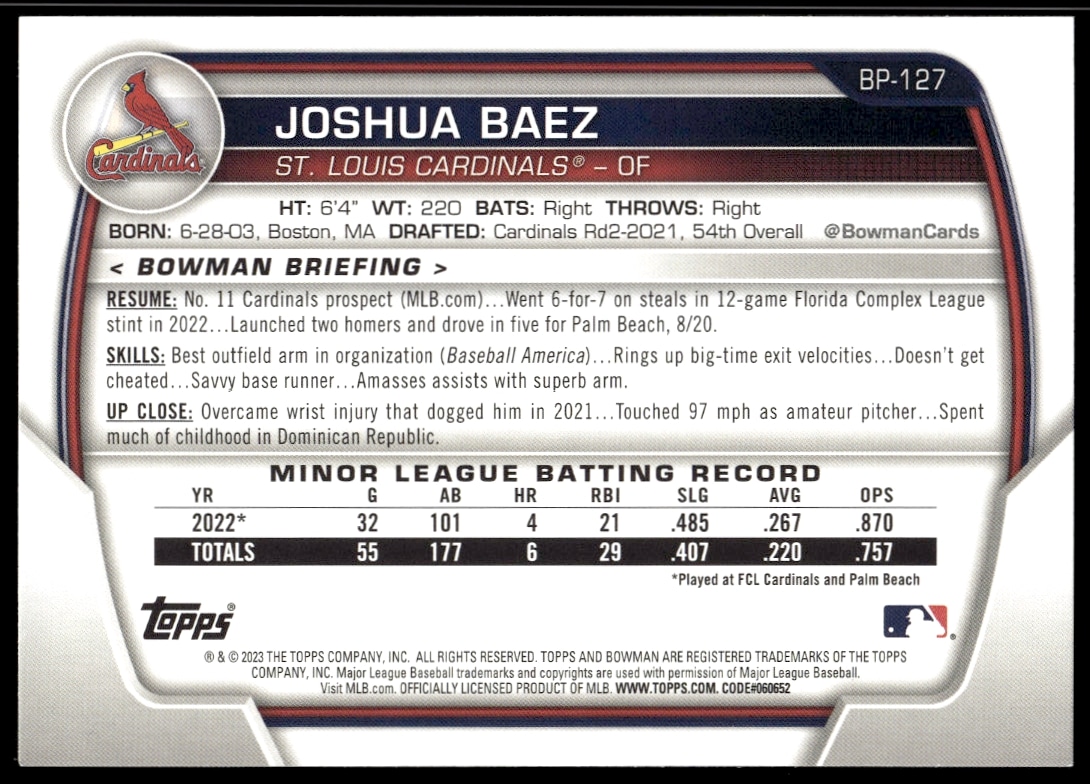 This Baseball card, from 2023 is part of the Bowman card set. Joshua Baez is featured and has a card number of BP-127.