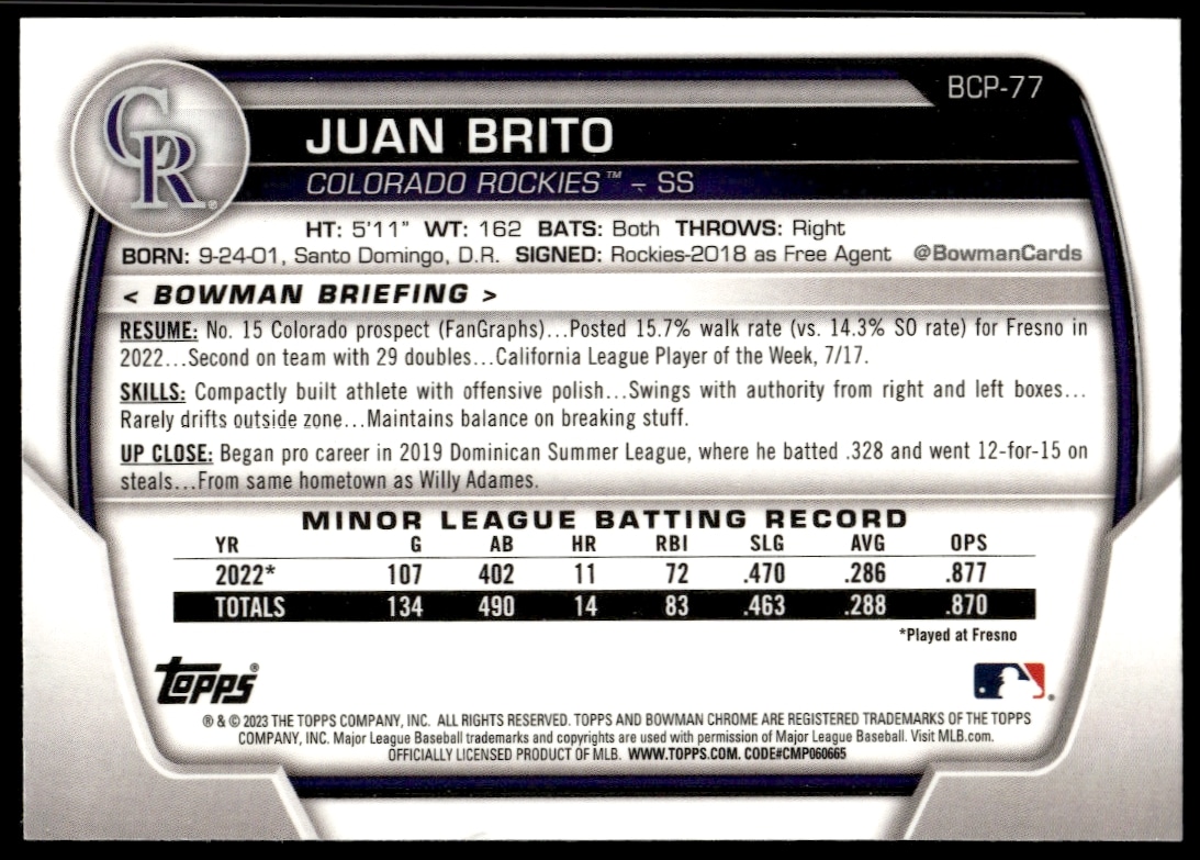 This Baseball card, from 2023 is part of the Bowman card set. Juan Brito is featured and has a card number of BCP-77.