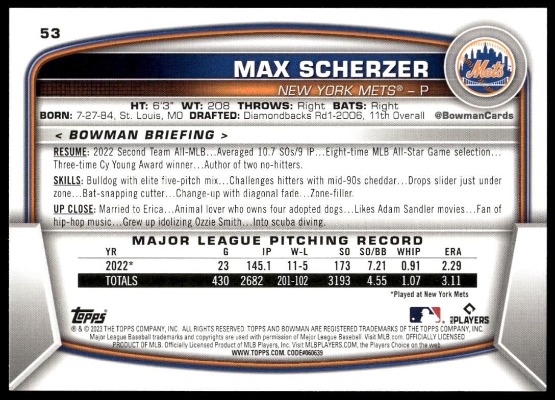 This Baseball card, from 2023 is part of the Bowman card set. Max Scherzer is featured and has a card number of 53.