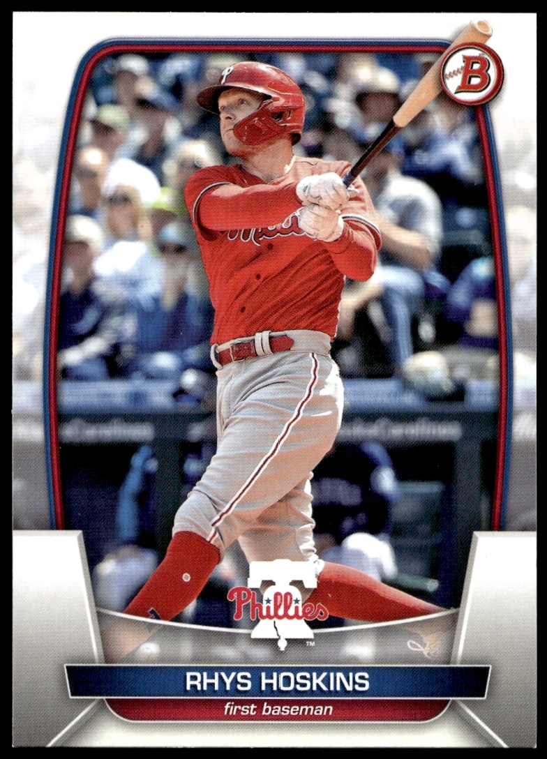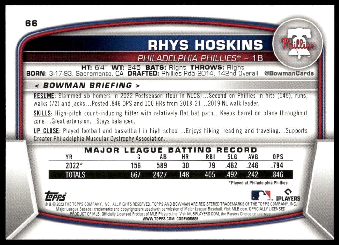 This Baseball card, from 2023 is part of the Bowman card set. Rhys Hoskins is featured and has a card number of 66.