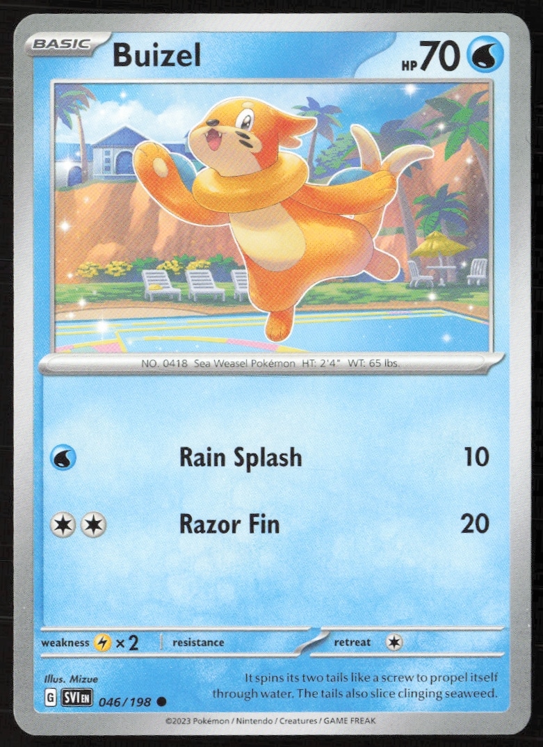 This Pokémon card, from 2023 is part of the Pokémon Scarlet & Violet card set. Buizel is featured and has a card number of 046/198.