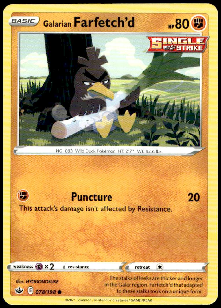 This Pokemon card, from 2023 is part of the Pokémon Scarlet & Violet – Base Set card set. Galarian Farfetch’d is featured and has a card number of 078/198.