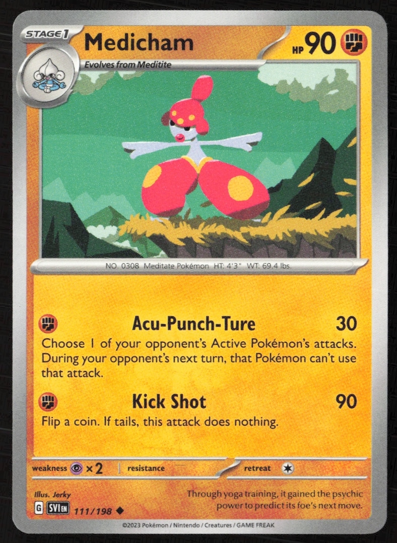 This Pokémon card, from 2023 is part of the Pokémon Scarlet & Violet card set. Medicham is featured and has a card number of 111/198.