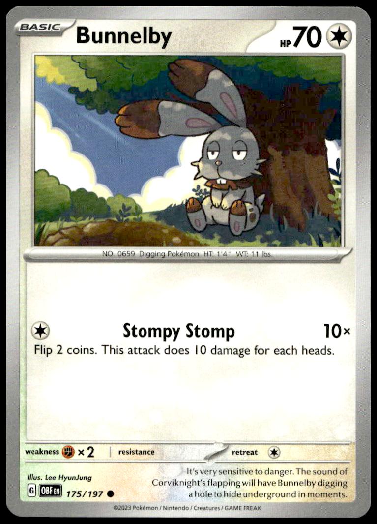 This Pokémon card, from 2023 is part of the Pokémon Scarlet & Violet – Obsidian Flames card set. Bunnelby is featured and has a card number of 175/197.