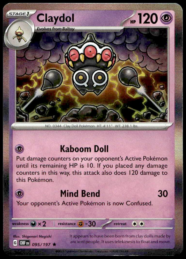 This Pokémon card, from 2023 is part of the Pokémon Scarlet & Violet – Obsidian Flames card set. Claydol is featured and has a card number of 095/197.