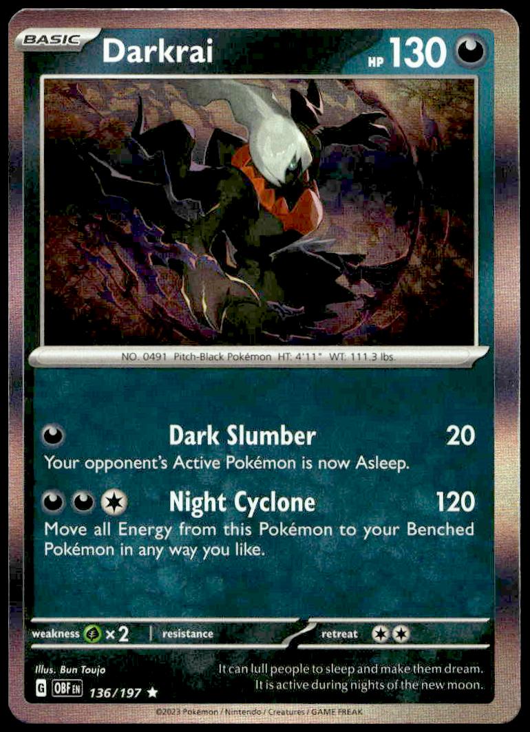 This Pokémon card, from 2023 is part of the Pokémon Scarlet & Violet – Obsidian Flames card set. Darkrai is featured and has a card number of 136/197.