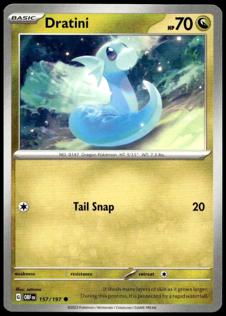 This Pokémon card, from 2023 is part of the Pokémon Scarlet & Violet – Obsidian Flames card set. Dratini is featured and has a card number of 157/197.