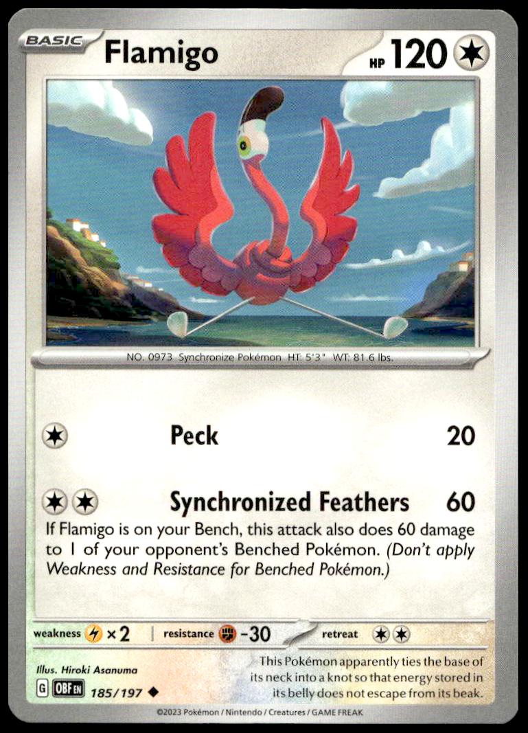 This Pokémon card, from 2023 is part of the Pokémon Scarlet & Violet – Obsidian Flames card set. Flamigo is featured and has a card number of 185/197.