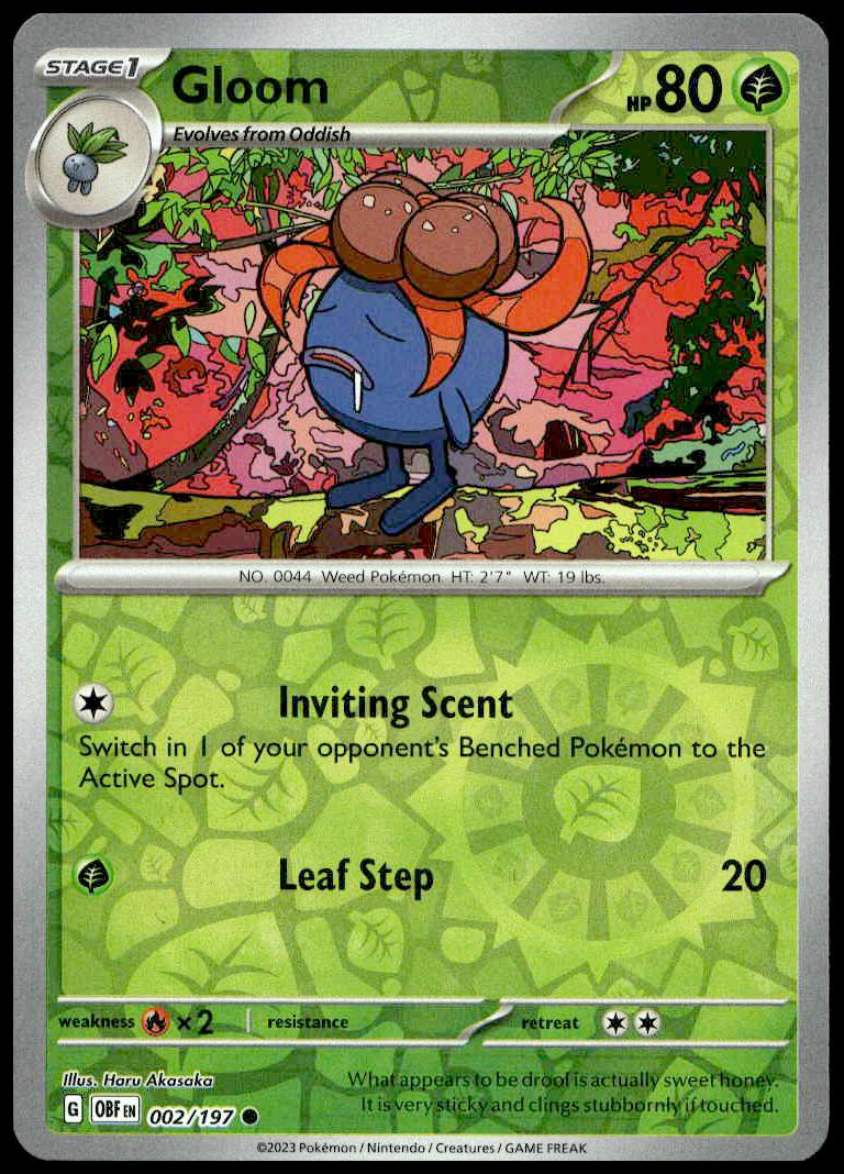 This Pokémon card, from 2023 is part of the Pokémon Scarlet & Violet – Obsidian Flames card set. Gloom is featured and has a card number of 002/197.
