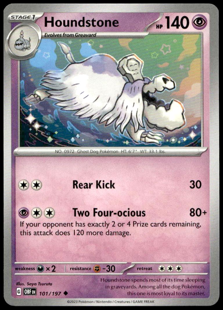This Pokémon card, from 2023 is part of the Pokémon Scarlet & Violet – Obsidian Flames card set. Houndstone is featured and has a card number of 101/197.
