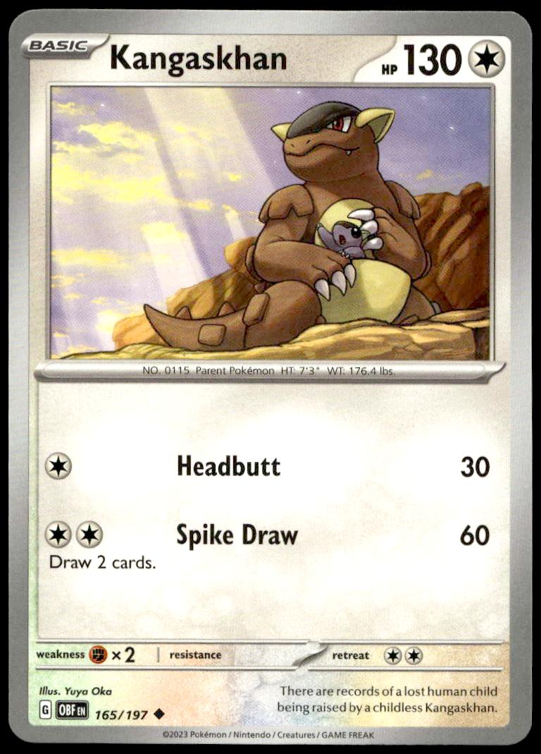 This Pokémon card, from 2023 is part of the Pokémon Scarlet & Violet – Obsidian Flames card set. Kangaskhan is featured and has a card number of 165/197.