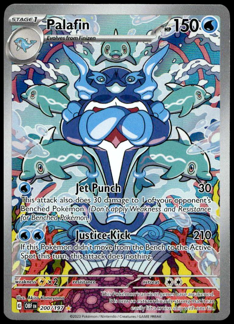This Pokémon card, from 2023 is part of the Pokémon Scarlet & Violet – Obsidian Flames card set. Palafin is featured and has a card number of 200/197.