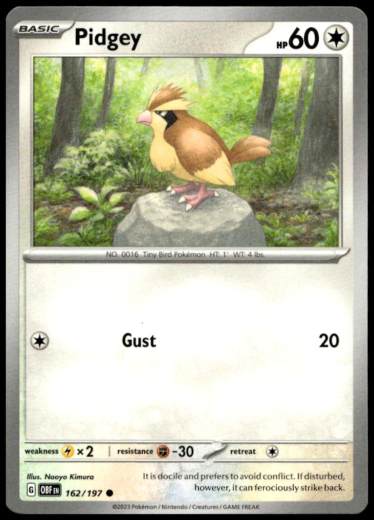 This Pokémon card, from 2023 is part of the Pokémon Scarlet & Violet – Obsidian Flames card set. Pidgey is featured and has a card number of 162/197.