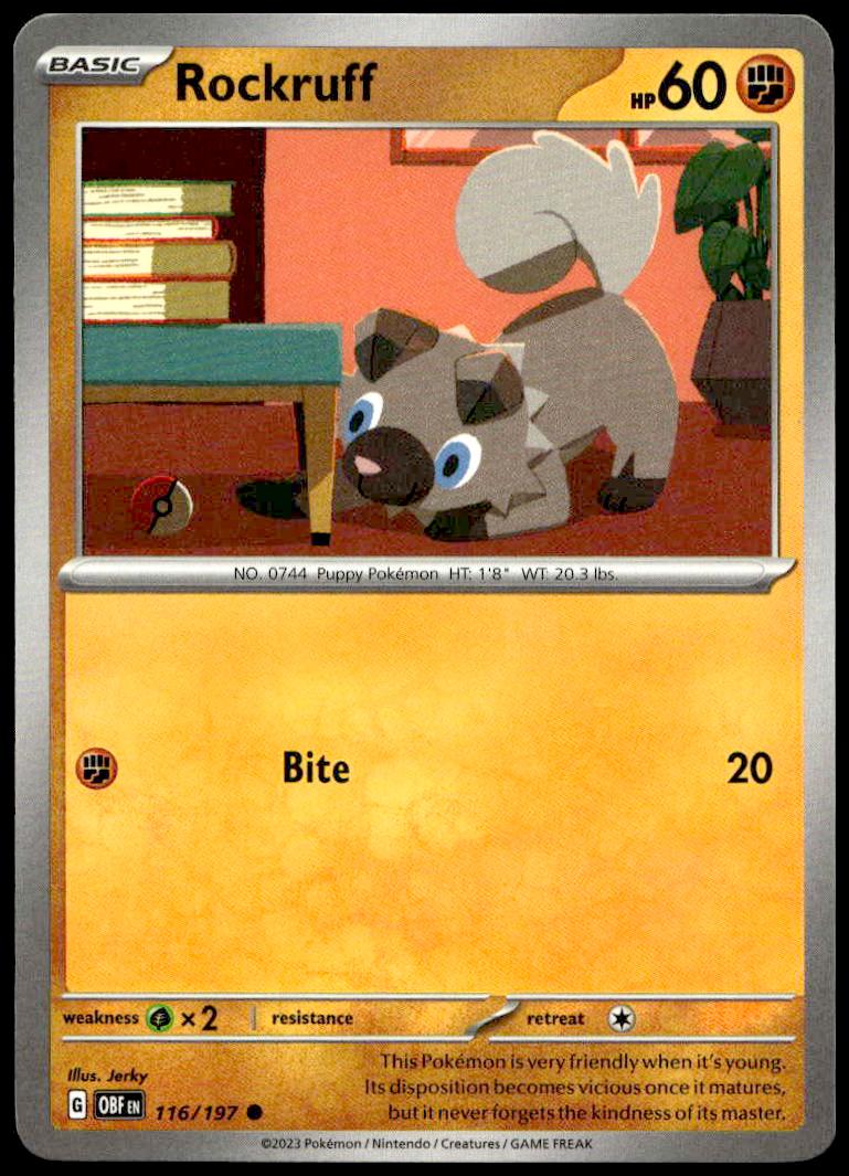 This Pokémon card, from 2023 is part of the Pokémon Scarlet & Violet – Obsidian Flames card set. Rockruff is featured and has a card number of 116/197.