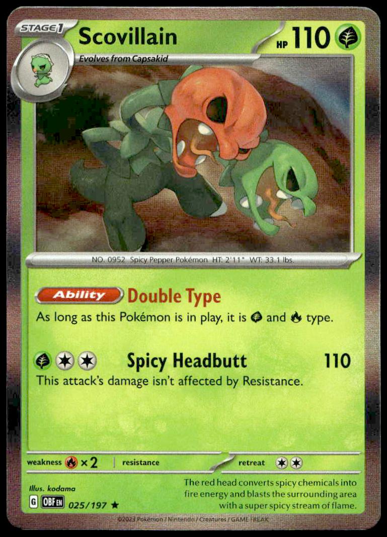 This Pokémon card, from 2023 is part of the Pokémon Scarlet & Violet – Obsidian Flames card set. Scovillain is featured and has a card number of 025/197.