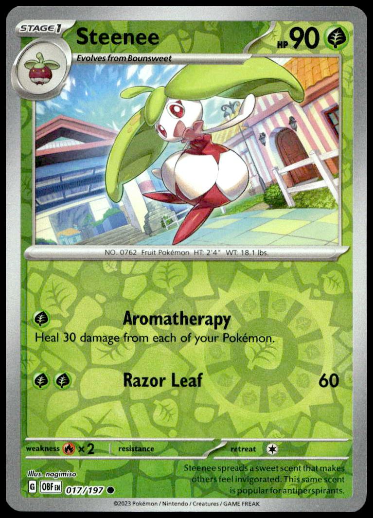 This Pokémon card, from 2023 is part of the Pokémon Scarlet & Violet – Obsidian Flames card set. Steenee is featured and has a card number of 017/197.