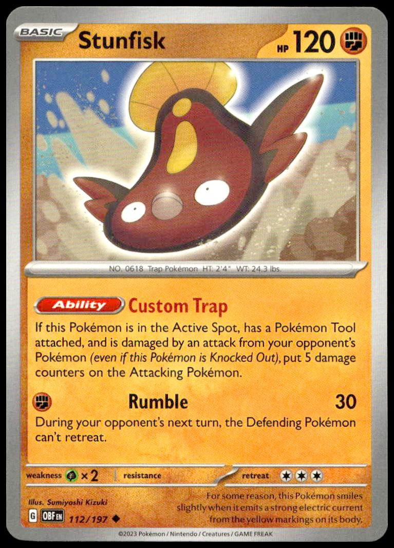 This Pokémon card, from 2023 is part of the Pokémon Scarlet & Violet – Obsidian Flames card set. Stunfisk is featured and has a card number of 112/197.