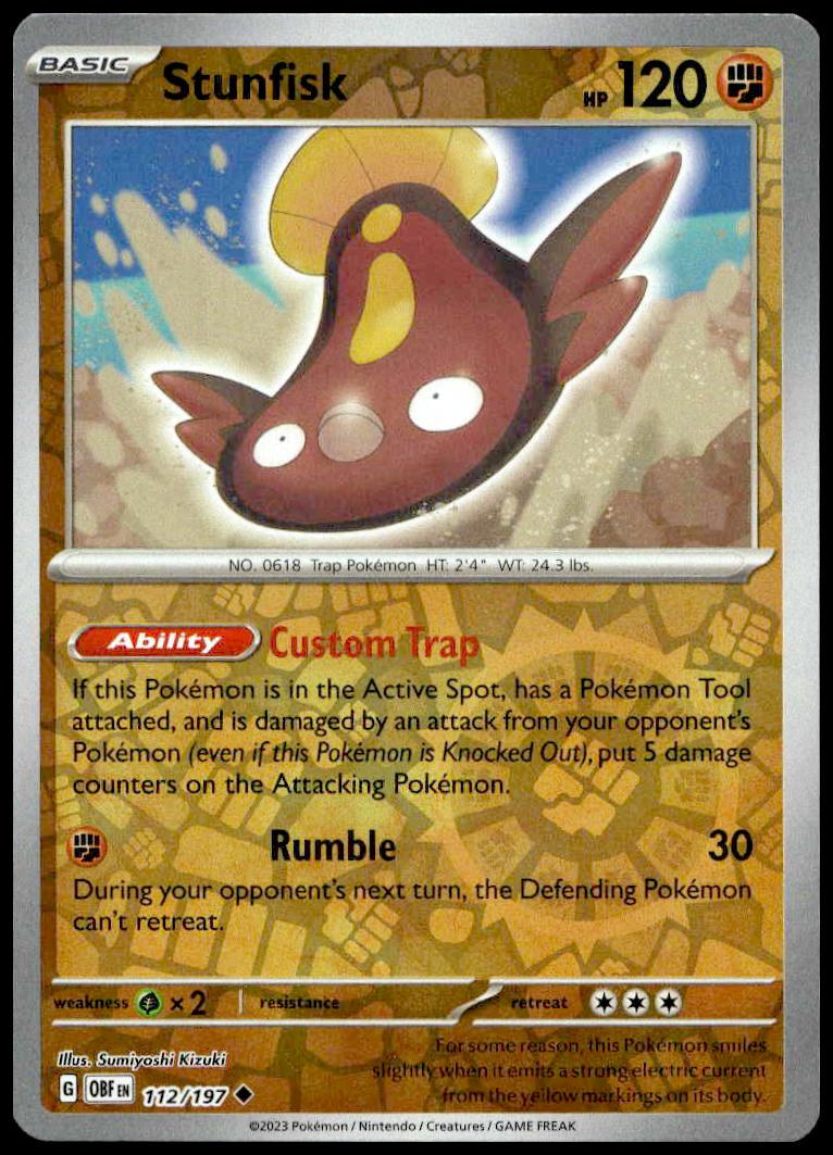 This Pokémon card, from 2023 is part of the Pokémon Scarlet & Violet – Obsidian Flames card set. Stunfisk is featured and has a card number of 112/197.