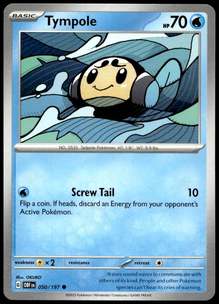 This Pokémon card, from 2023 is part of the Pokémon Scarlet & Violet – Obsidian Flames card set. Tympole is featured and has a card number of 050/197.