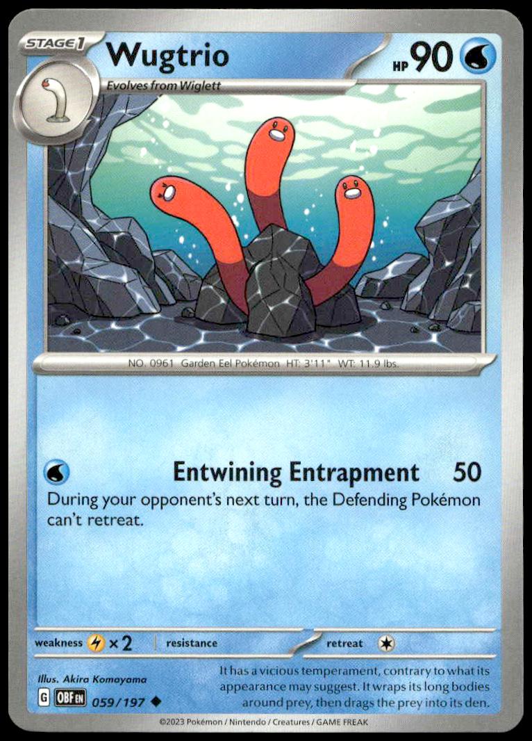This Pokémon card, from 2023 is part of the Pokémon Scarlet & Violet – Obsidian Flames card set. Wugtrio is featured and has a card number of 059/197.