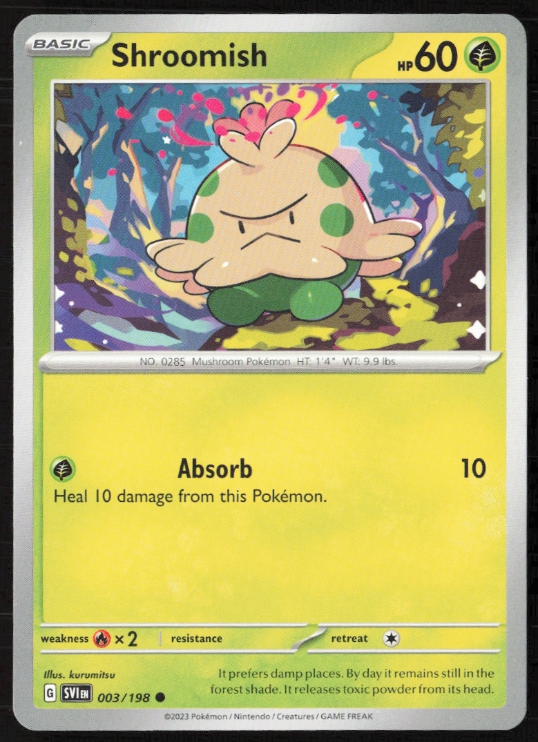 This Pokémon card, from 2023 is part of the Pokémon Scarlet & Violet card set. Shroomish is featured and has a card number of 003/198.