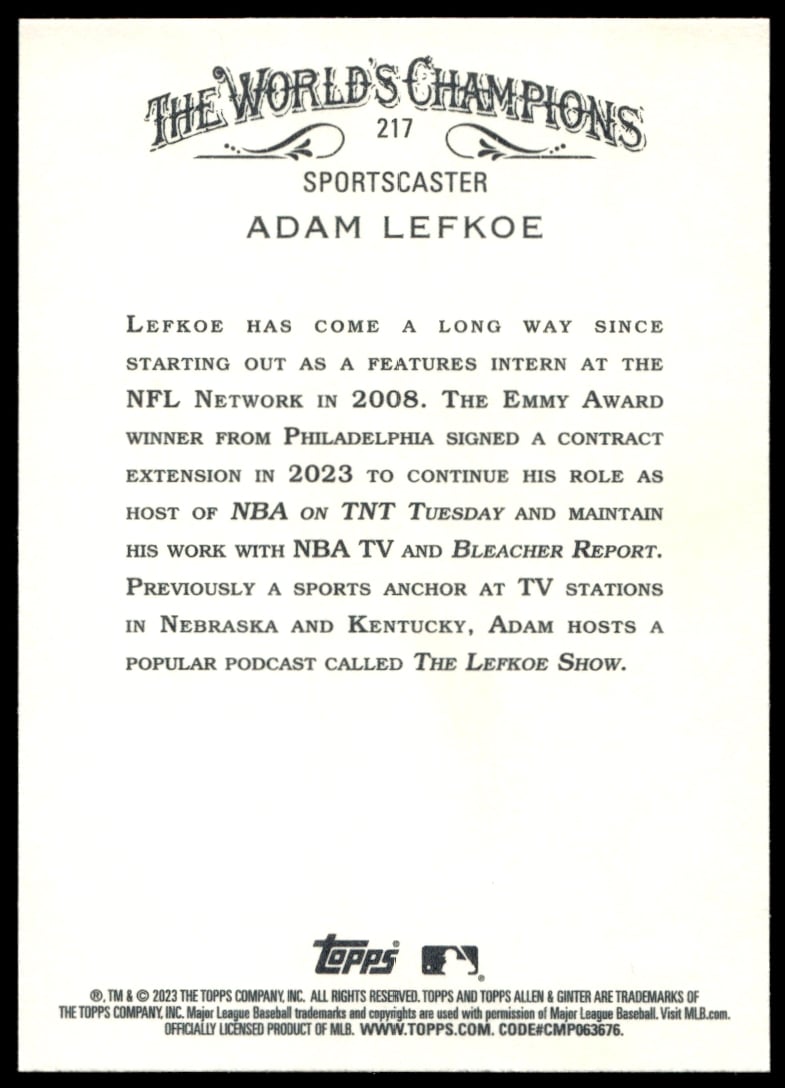 This Baseball card, from 2023 is part of the Topps Allen & Ginter card set. Adam Lefkoe is featured and has a card number of 217.
