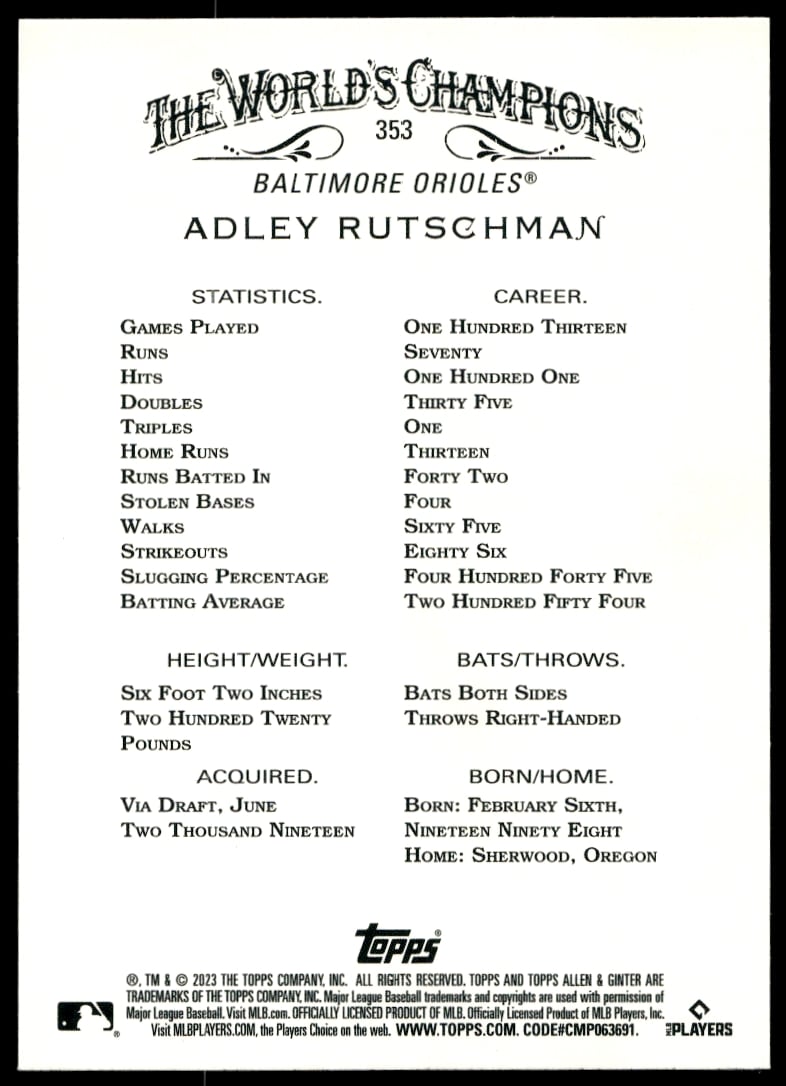 This Baseball card, from 2023 is part of the Topps Allen & Ginter card set. Adley Rutschman is featured and has a card number of 353.