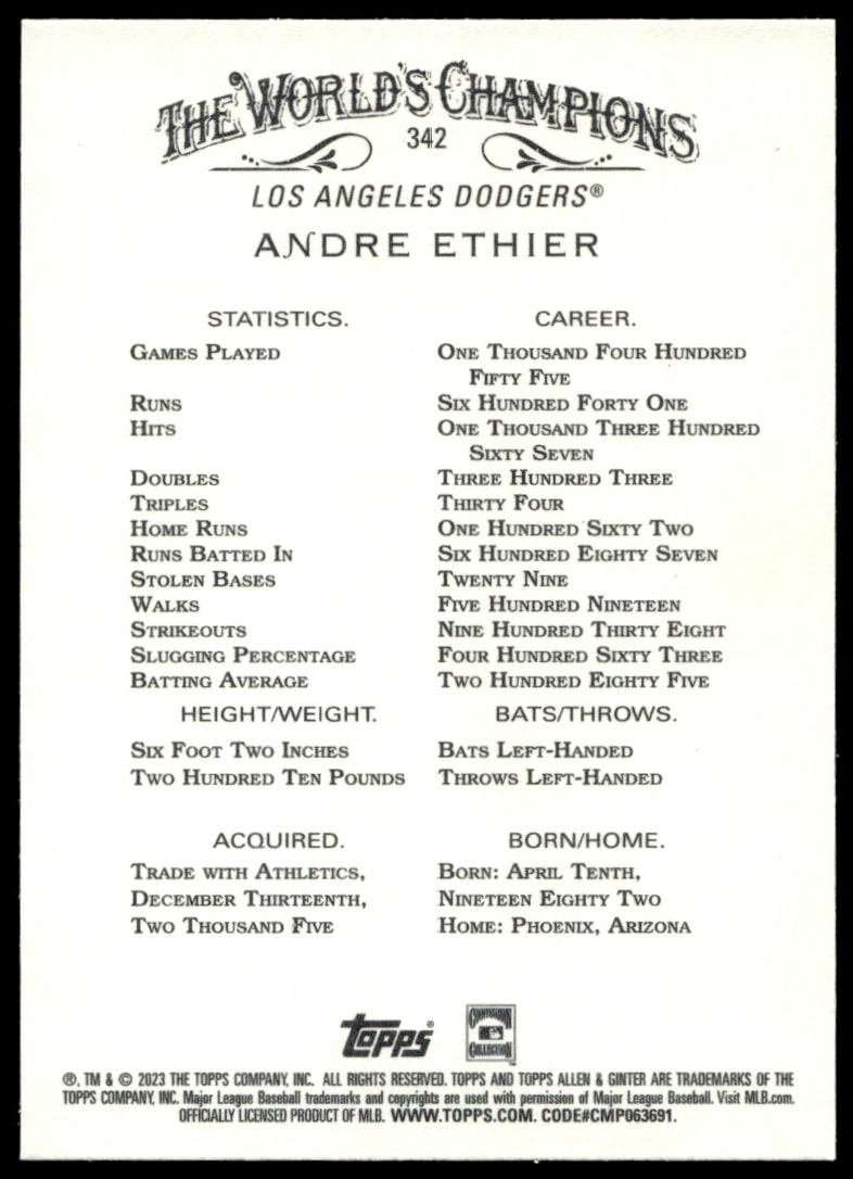 This Baseball card, from 2023 is part of the Topps Allen & Ginter card set. Andre Ethier is featured and has a card number of 342.