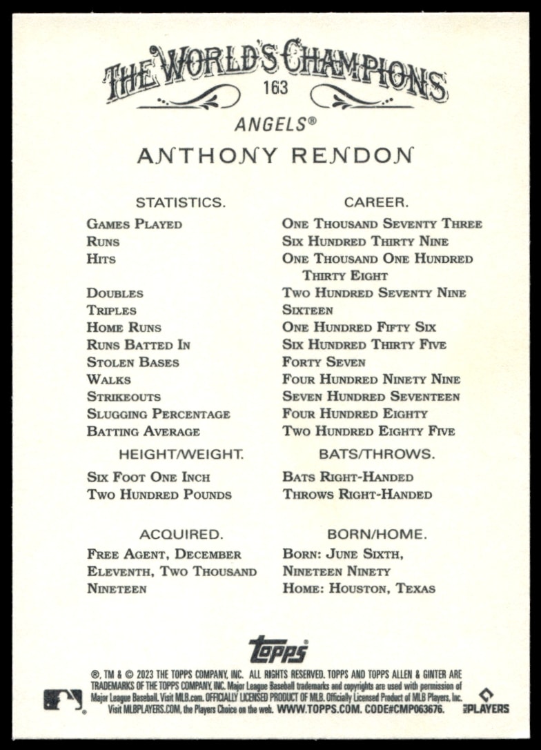 This Baseball card, from 2023 is part of the Topps Allen & Ginter card set. Anthony Rendon is featured and has a card number of 163.