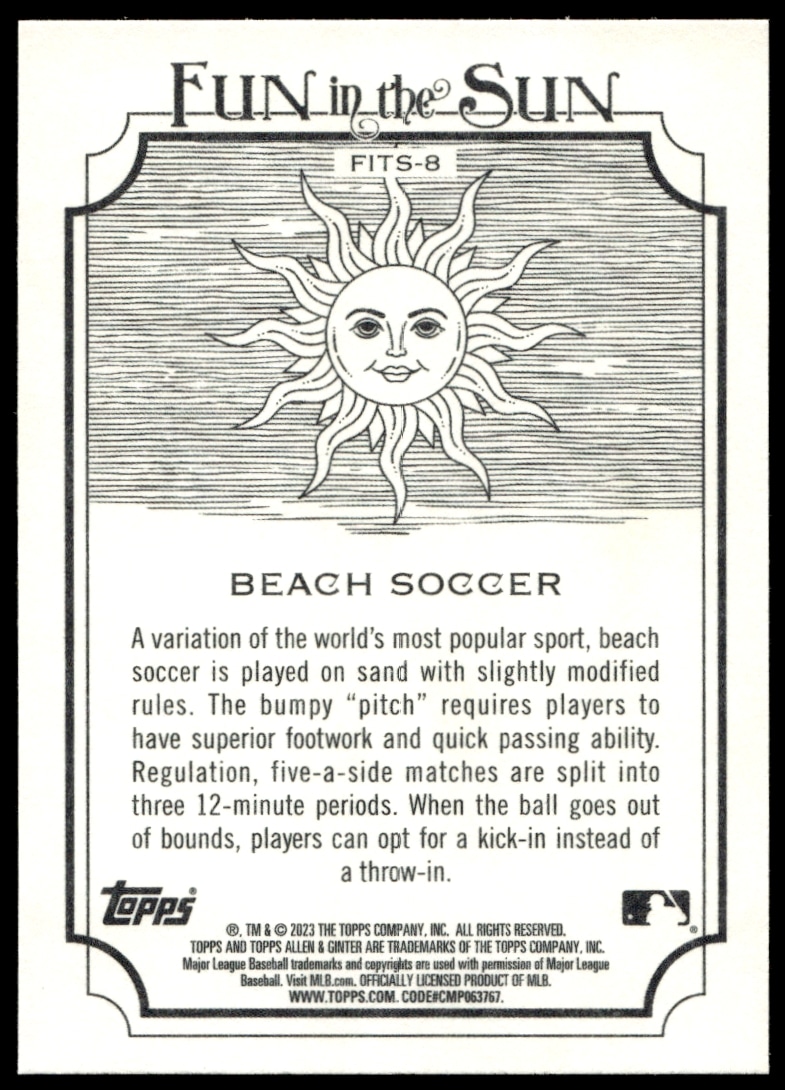 This Baseball card, from 2023 is part of the Topps Allen & Ginter card set. Beach Soccer is featured and has a card number of FITS-8.