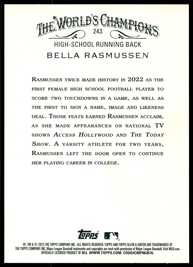 This Baseball card, from 2023 is part of the Topps Allen & Ginter card set. Bella Rasmussen is featured and has a card number of 243.