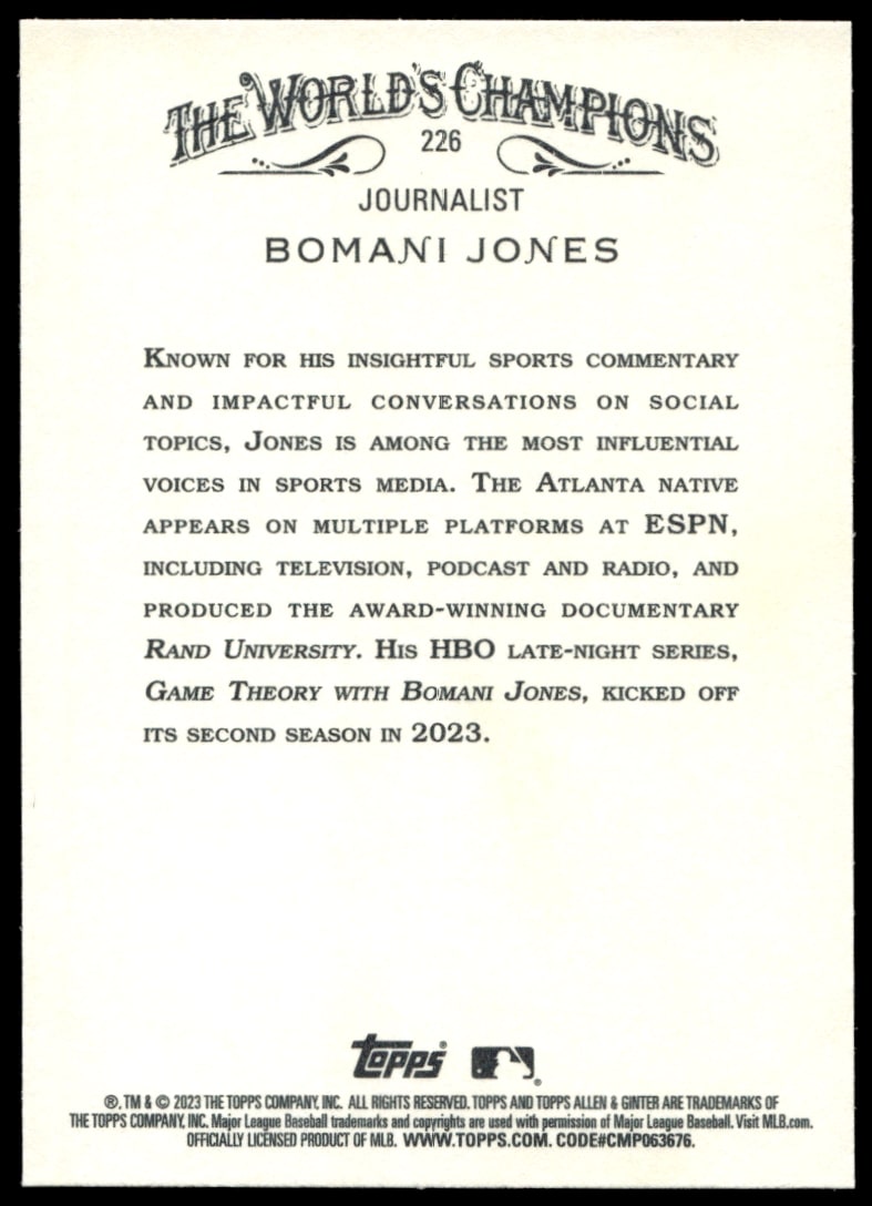 This Baseball card, from 2023 is part of the Topps Allen & Ginter card set. Bomani Jones is featured and has a card number of 226.