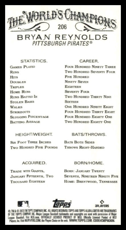 This BaseballΒ card, from 2023 is part of the Topps Allen & GinterΒ card set. Bryan Reynolds is featured and has a card number of 206.