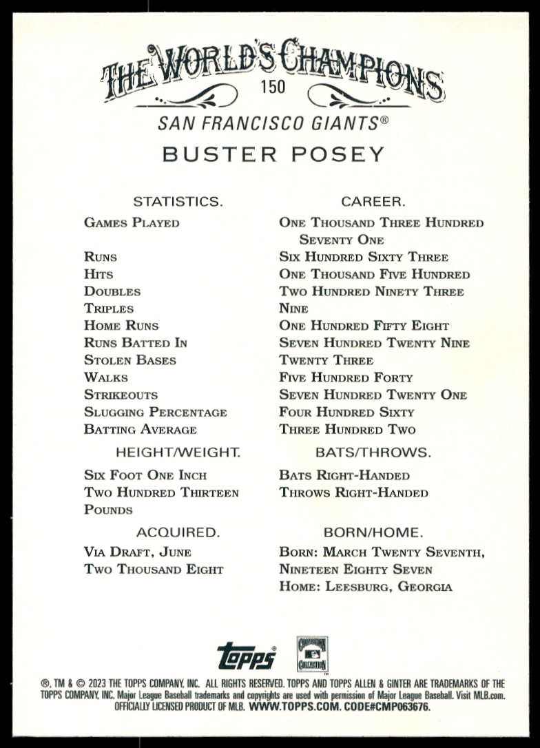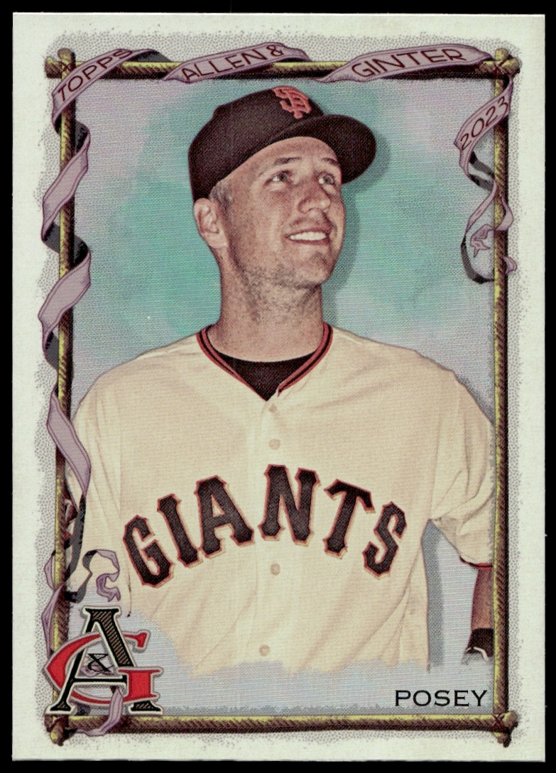 This BaseballΒ card, from 2023 is part of the Topps Allen & GinterΒ card set. Buster Posey is featured and has a card number of 150.
