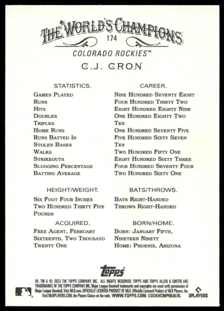 This Baseball card, from 2023 is part of the Topps Allen & Ginter card set. C.J. Cron is featured and has a card number of 174.