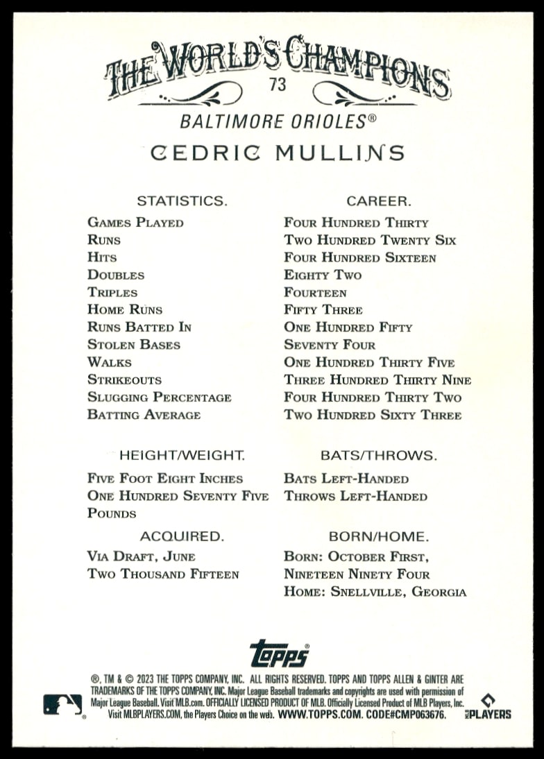 This Baseball card, from 2023 is part of the Topps Allen & Ginter card set. Cedric Mullins is featured and has a card number of 73.