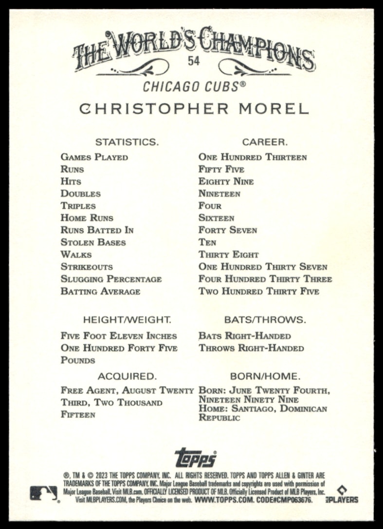 This BaseballΒ card, from 2023 is part of the Topps Allen & GinterΒ card set. Christopher Morel is featured and has a card number of 54.
