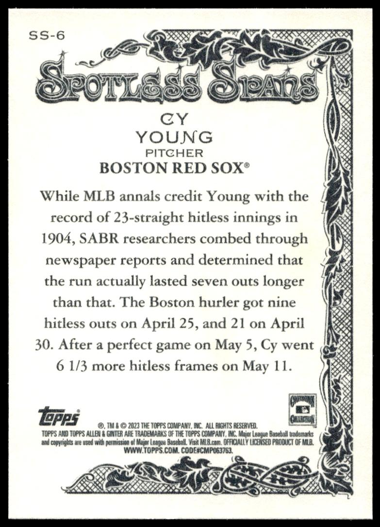 This Baseball card, from 2023 is part of the Topps Allen & Ginter card set. Cy Young is featured and has a card number of SS-6.
