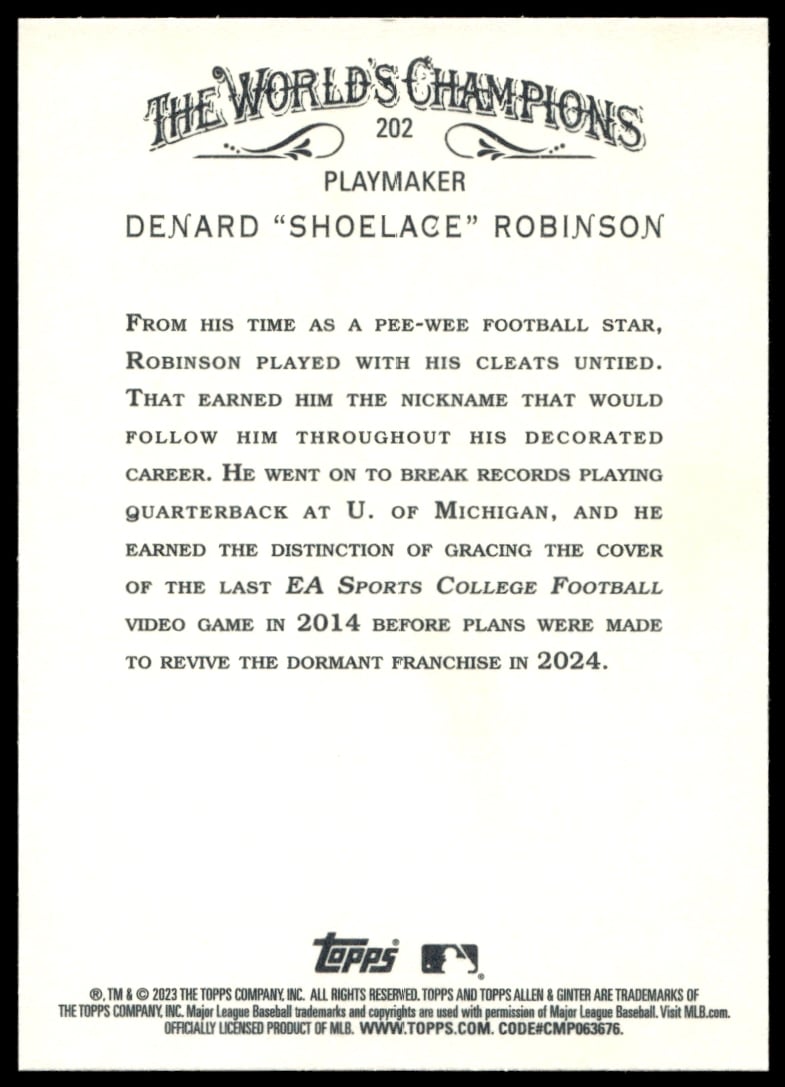 This Baseball card, from 2023 is part of the Topps Allen & Ginter card set. Denard “Shoelace” Robinson is featured and has a card number of 202.