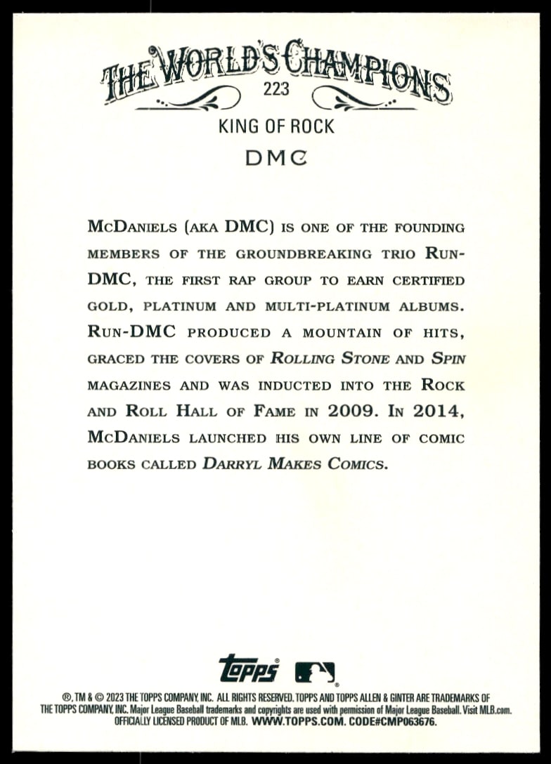 This Baseball card, from 2023 is part of the Topps Allen & Ginter card set. DMC is featured and has a card number of 223.