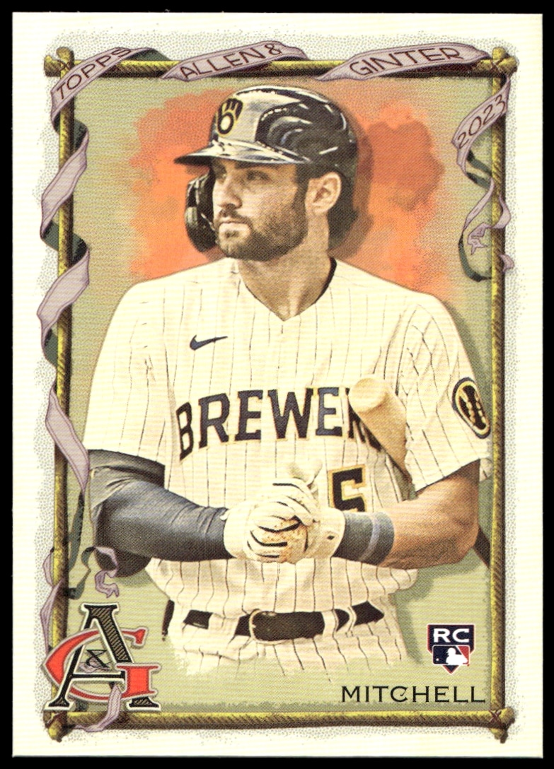 This BaseballΒ card, from 2023 is part of the Topps Allen & GinterΒ card set. Garrett Mitchell is featured and has a card number of 117.