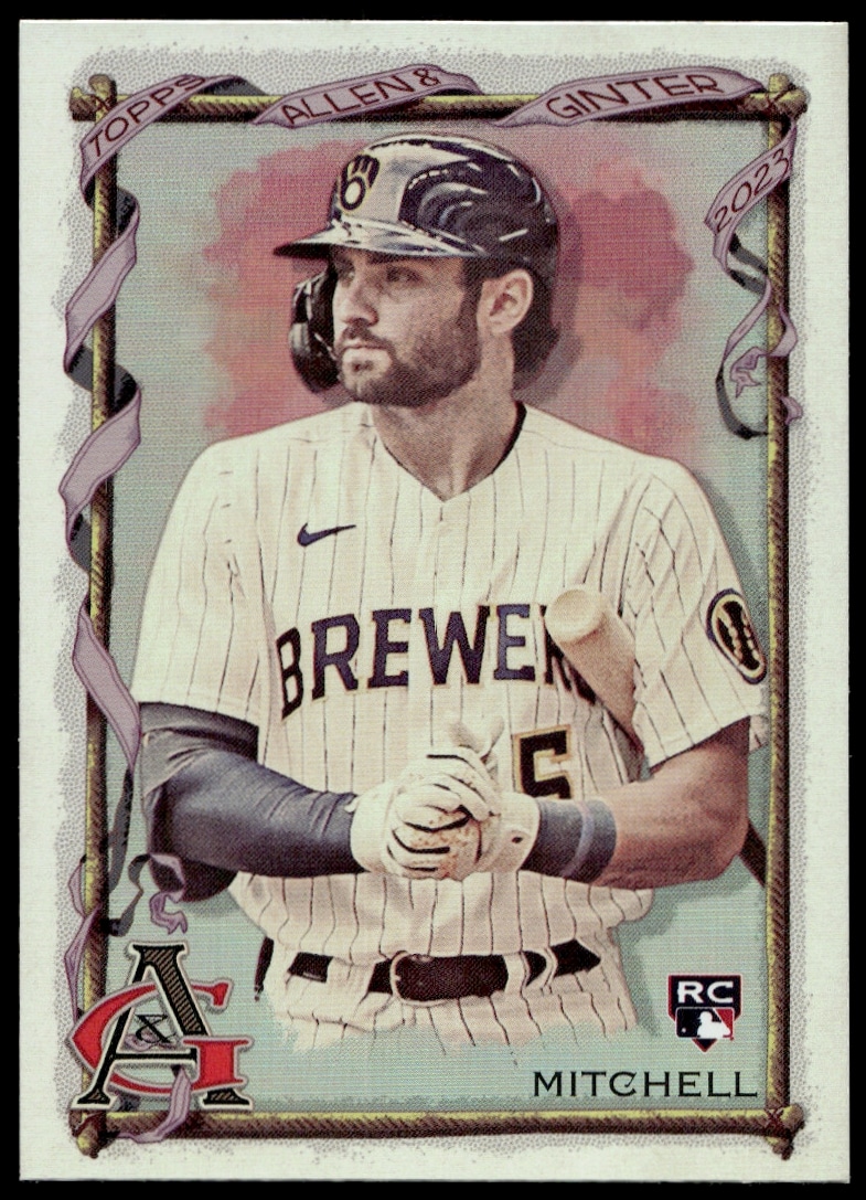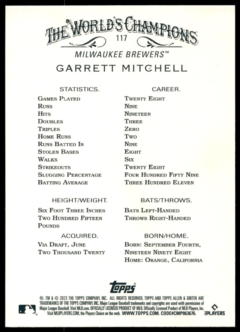 This BaseballΒ card, from 2023 is part of the Topps Allen & GinterΒ card set. Garrett Mitchell is featured and has a card number of 117.