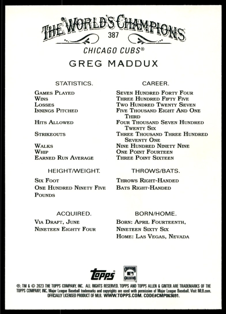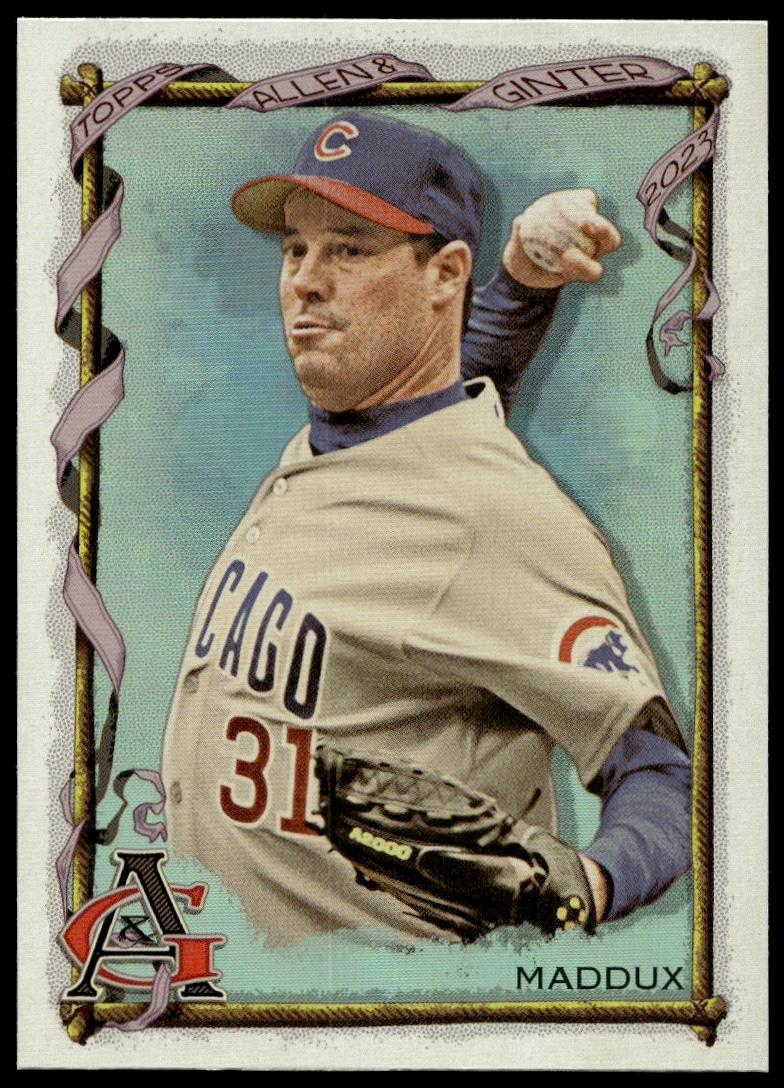 This BaseballΒ card, from 2023 is part of the Topps Allen & GinterΒ card set. Greg Maddux is featured and has a card number of 387.