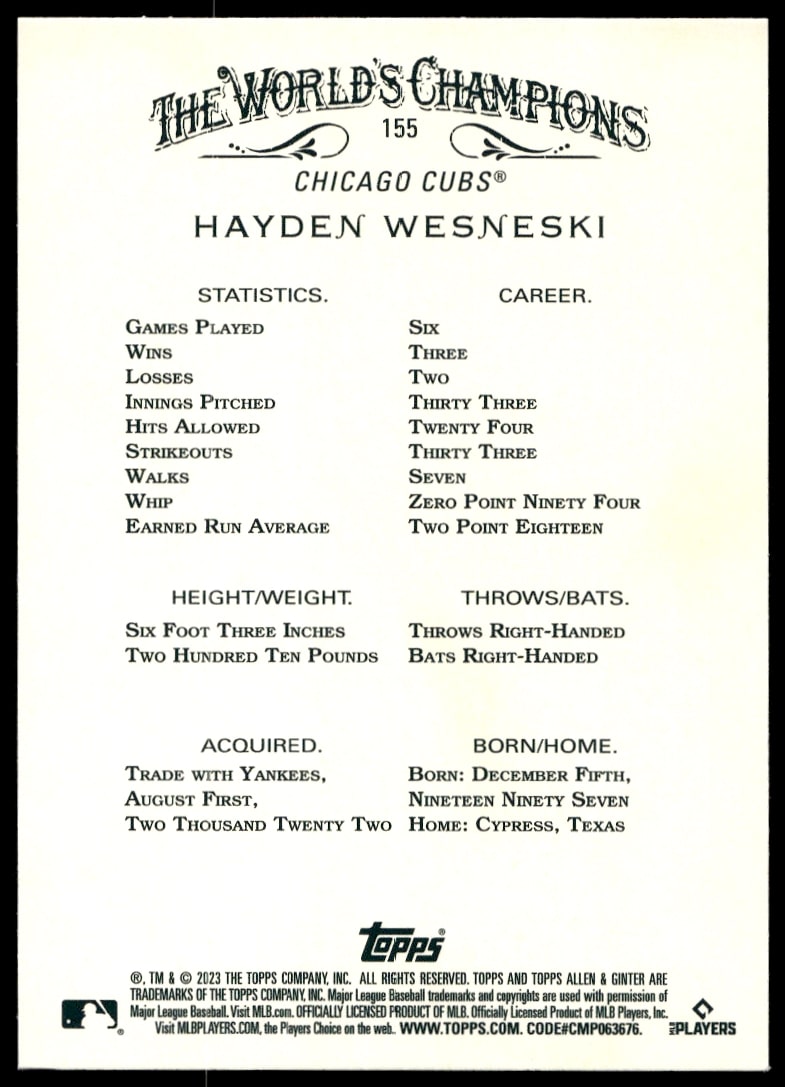 This Baseball card, from 2023 is part of the Topps Allen & Ginter card set. Hayden Wesneski is featured and has a card number of 155.