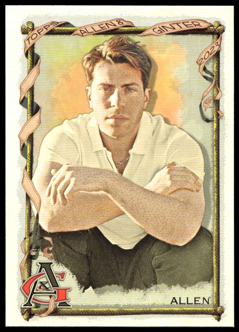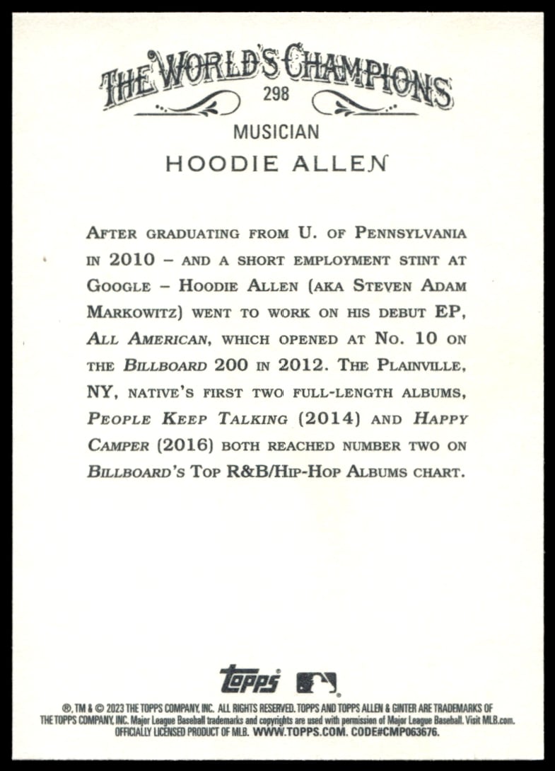 This Baseball card, from 2023 is part of the Topps Allen & Ginter card set. Hoodie Allen is featured and has a card number of 298.