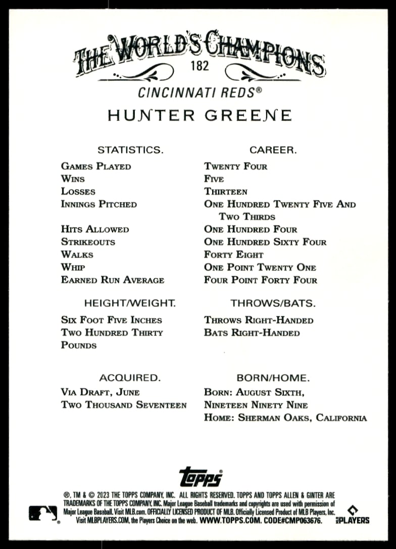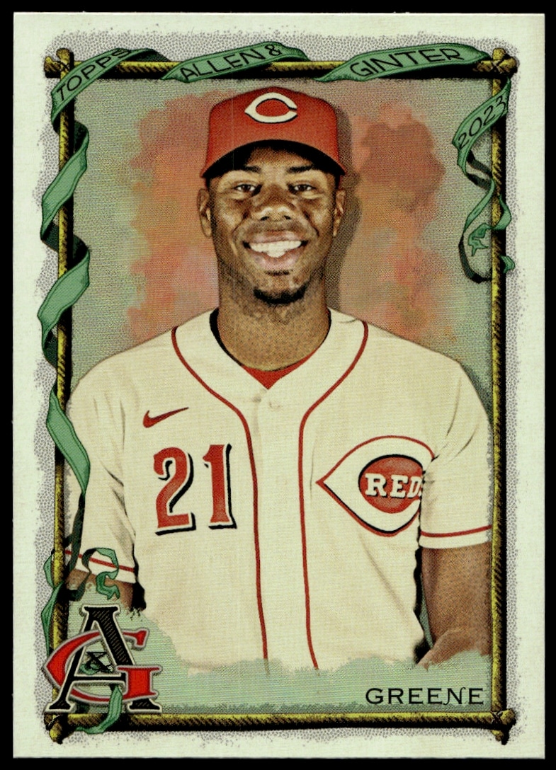 This Baseball card, from 2023 is part of the Topps Allen & Ginter card set. Hunter Greene is featured and has a card number of 182.